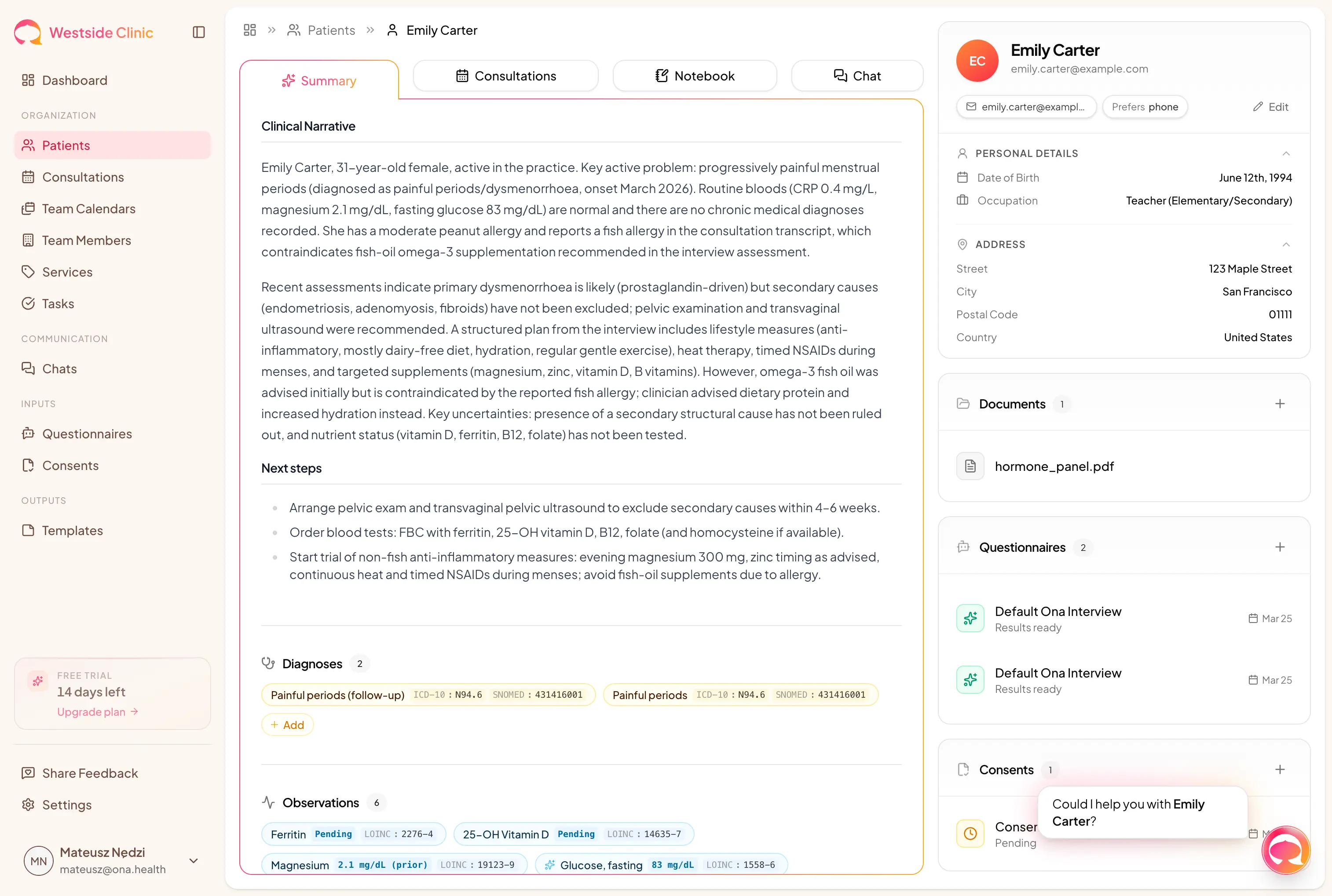 Full access to every feature — booking, scheduling, chats, video calls, questionnaires, consents, templates, tasks, insurance claims, analytics, and all AI capabilities — for 14 days. No credit card required. All your data is preserved if you decide to subscribe.